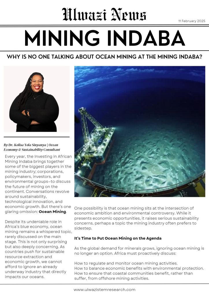My participation at the Indaba was particularly timely given the piece I wrote for Ulwazi News on ocean mining. The article explored the increasing interest in deep-sea mineral extraction and its potential environmental consequences. While ocean mining is often touted as a solution to meet the demand for rare minerals used in renewable energy technologies, it poses significant risks to marine ecosystems.