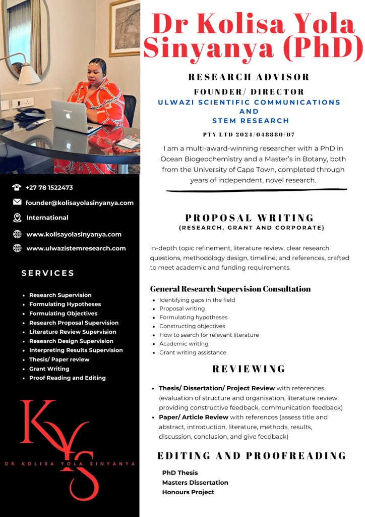 Ulwazi Scientific Communications and STEM Research is the consulting company I founded to bridge the gap between science, policy, and society. We support researchers, institutions, and NGOs in communicating their work, securing funding, and designing impactful, evidence-based projects with a particular focus on ocean research.