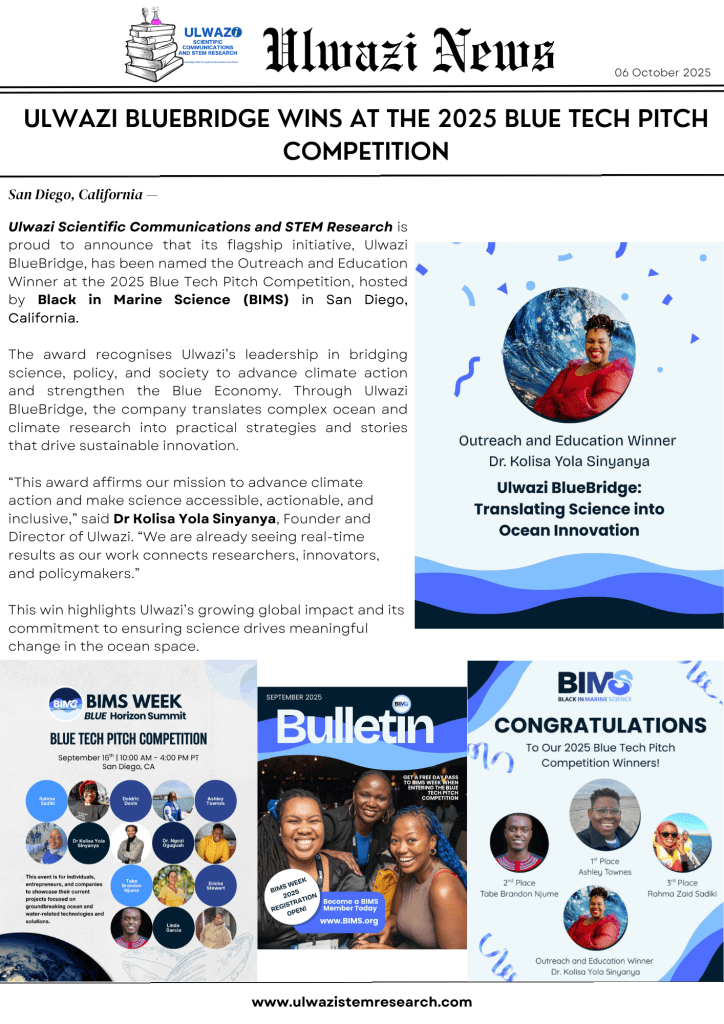 I screamed when I heard Ulwazi BlueBridge announced as the Outreach & Education Winner at the 2025 Blue Tech Pitch Competition, hosted virtually by Black in Marine Science (BIMS). This recognition means more than words can capture. My research company, Ulwazi, was founded to make science accessible, actionable, and relatable, moving research out of the academic bubble and into the hands of policymakers, innovators, and communities who can use it to drive change.