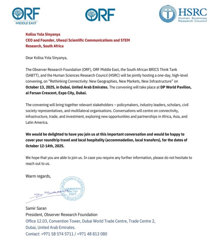 When the initial invitation arrived, I approached it with caution. I was unfamiliar with the organisation at first and, like many professionals who receive frequent international requests, I remained sceptical until the process became clearer. That clarity came when the South African BRICS Think Tank (SABTT) joined the communication, confirming the seriousness and scale of the engagement. The invitation is to participate in a high-level BRICS roundtable convening in the United Arab Emirates, with engagements taking place across Dubai and Abu Dhabi. The roundtable, titled “Rethinking Connectivity: New Geographies, New Markets, New Infrastructure,” is jointly hosted by the Observer Research Foundation (ORF), ORF Middle East, the SABTT, and South Africa’s Human Sciences Research Council (HSRC).